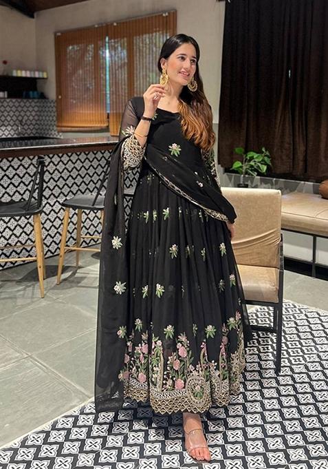 Indulge in the elegance of timeless Indian fashion with our Black Embroidered Georgette Anarkali Set.