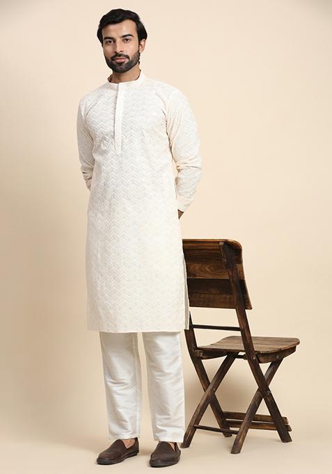 Elevate Your Ethnic Wardrobe With This Stunning Chikankari Cotton In A Timeless Cream Shade. Crafted To Perfection By Rawayi, This Kurta For Men Is A Graceful Blend Of Tradition And Modern Design Sensibilities. The Soft And Translucent Texture Of Cotto