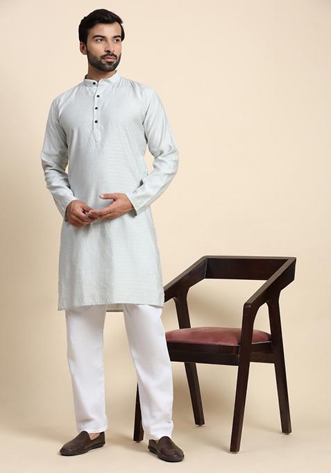 Elevate Your Ethnic Wardrobe With This Stunning Self Weaved Viscose Rayon In A Timeless Light Grey Shade. Crafted To Perfection By Rawayi, This Kurta For Men Is A Graceful Blend Of Tradition And Modern Design Sensibilities. The Soft And Translucent Tex