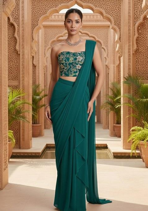 Teal Crepe Solid Pre draped saree Set With Embroidery Blouse